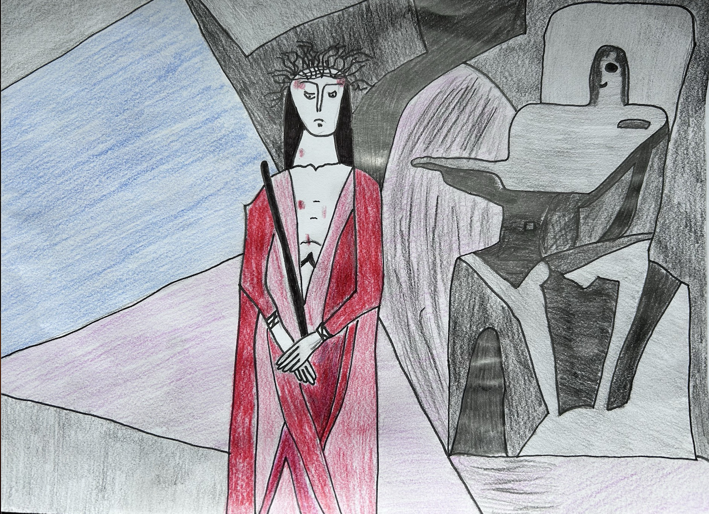 Auf Einladung der Kirchengemeinde haben Schülerinnen und Schüler der FOS 11 und 12 im Gestaltungsunterricht Bilder zu Stationen der Passionsgeschichte geschaffen. Bereits im Vorfeld hatte Frau Otte-Varolgil gemeinsam mit Martin Autschbach die Schülerinnen und Schüler aus dem Ethik- und Religionsunterricht mit der Thematik vertraut gemacht. Anschließend entstanden die Arbeiten zur Originalmusik von Bach.